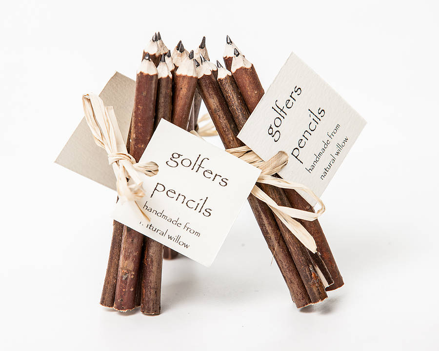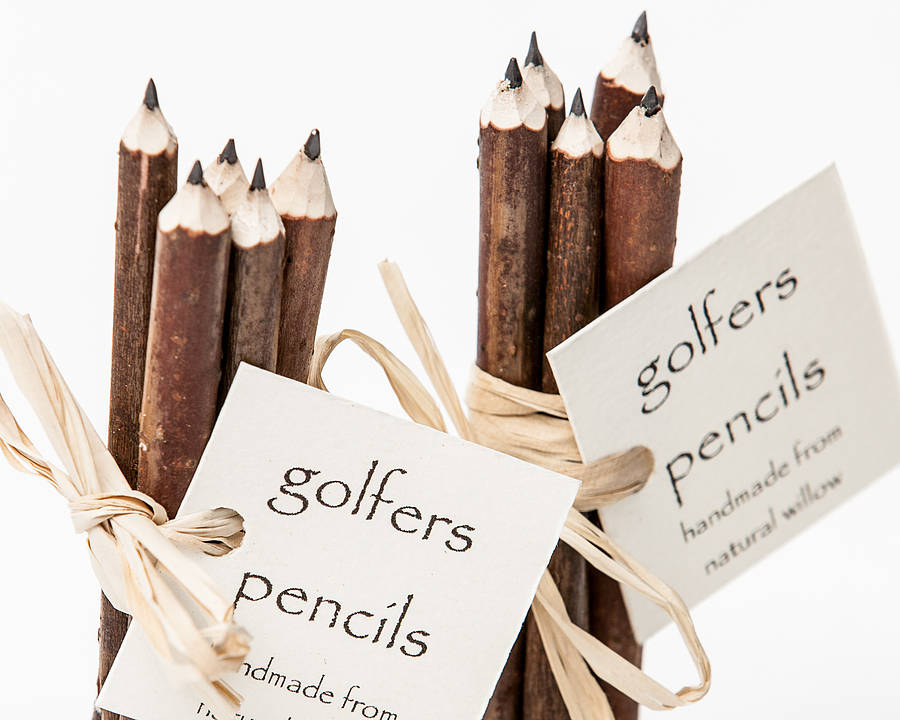 Beautiful, handmade willow stick pencils, perfect for golfers. You won't mind putting a 10 on your scorecard with these pencils! With plenty of lead inside, enough for many rounds of golf, they can be easily sharpened with a penknife or similar.