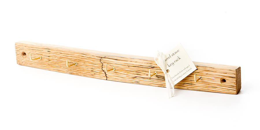 These racks are made from the staves of Scotch whisky barrels. They have 5 brass hooks for keys and look great anywhere in the house.