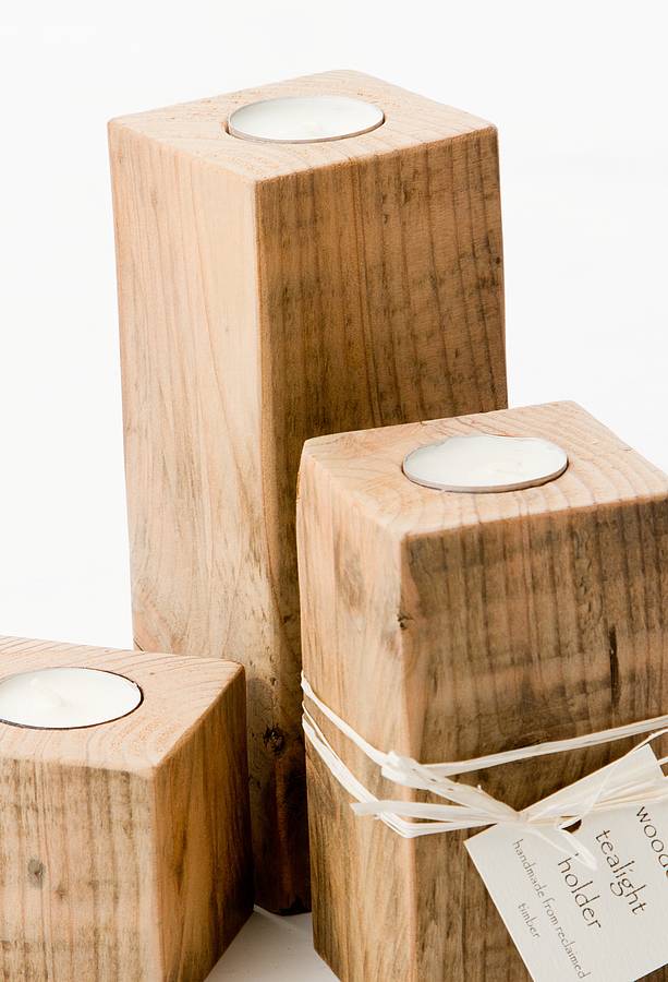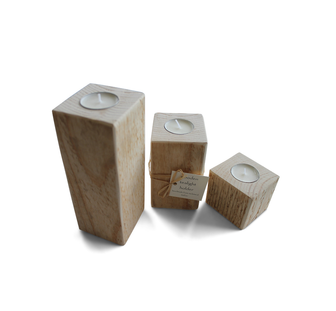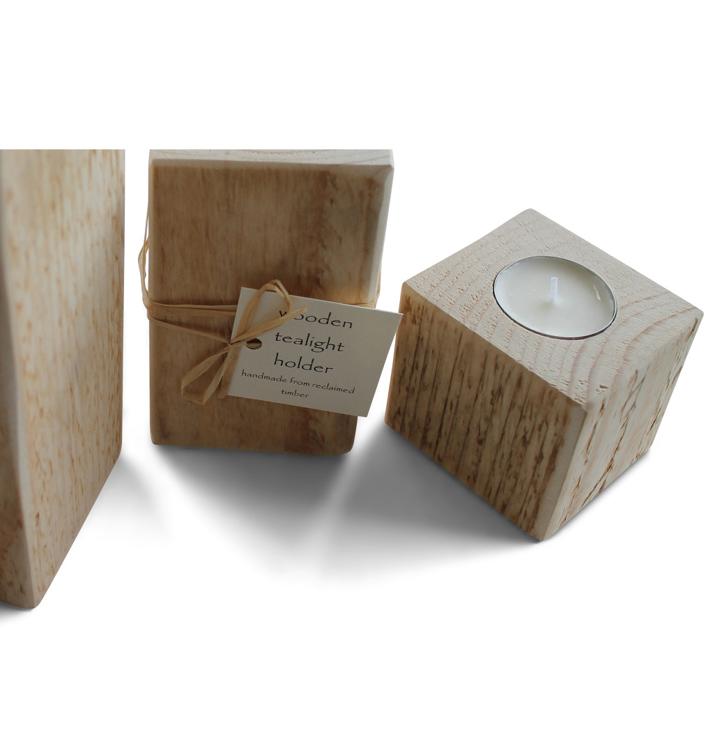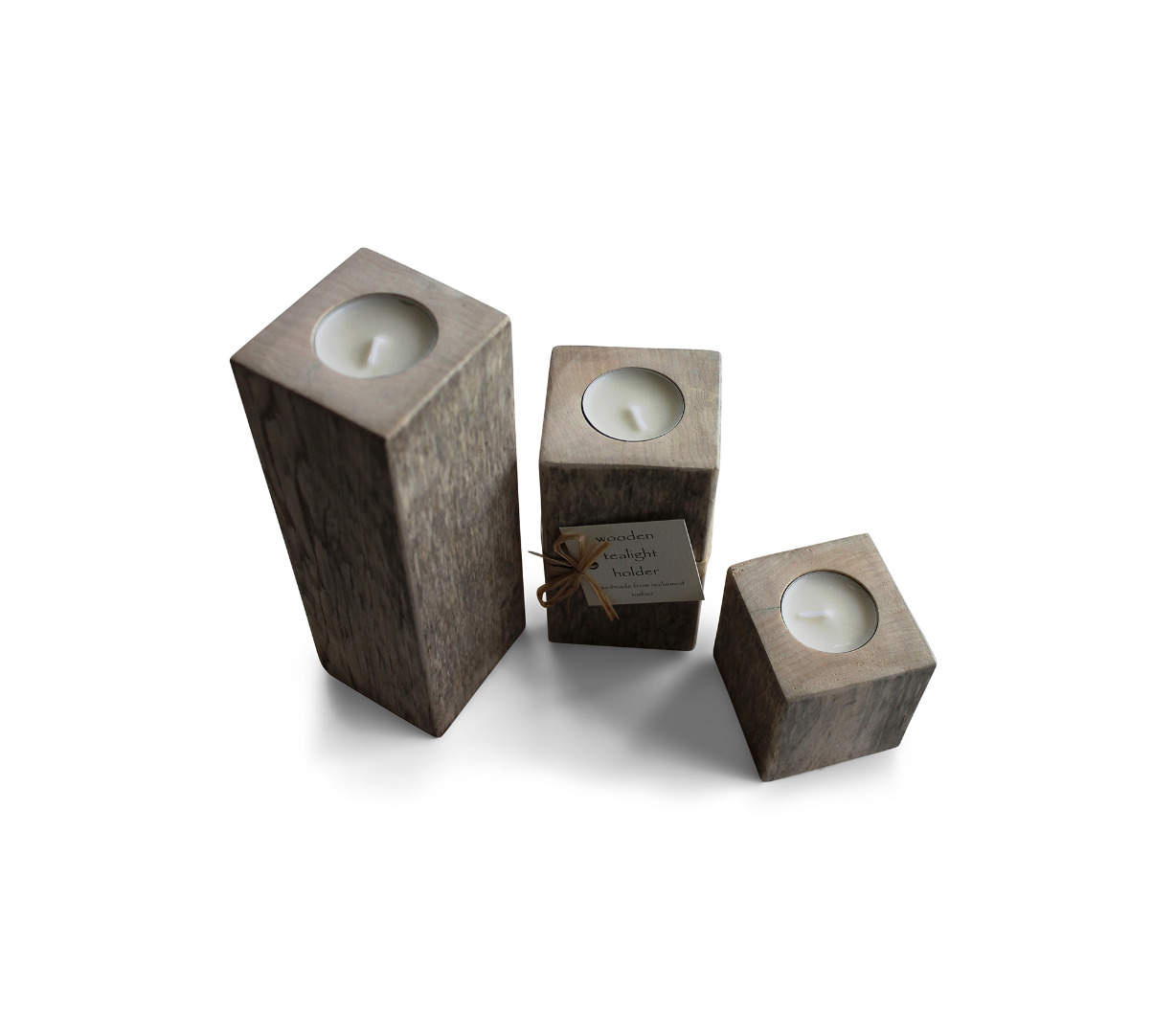 Beautiful set of three tealight holders handcrafted from recovered timber from various sources.