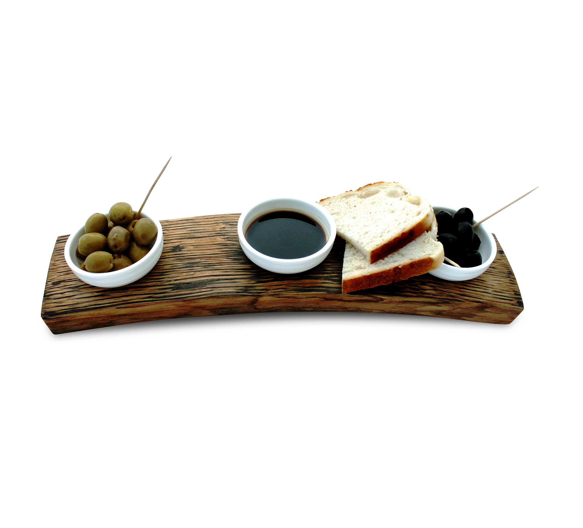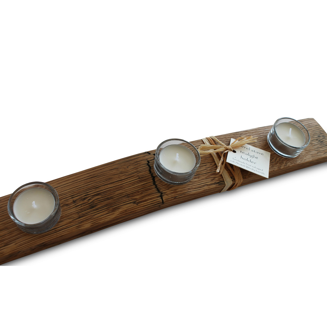 Beautiful tealight holder made from a section of Scotch whisky barrel stave with 3 small glass holders.