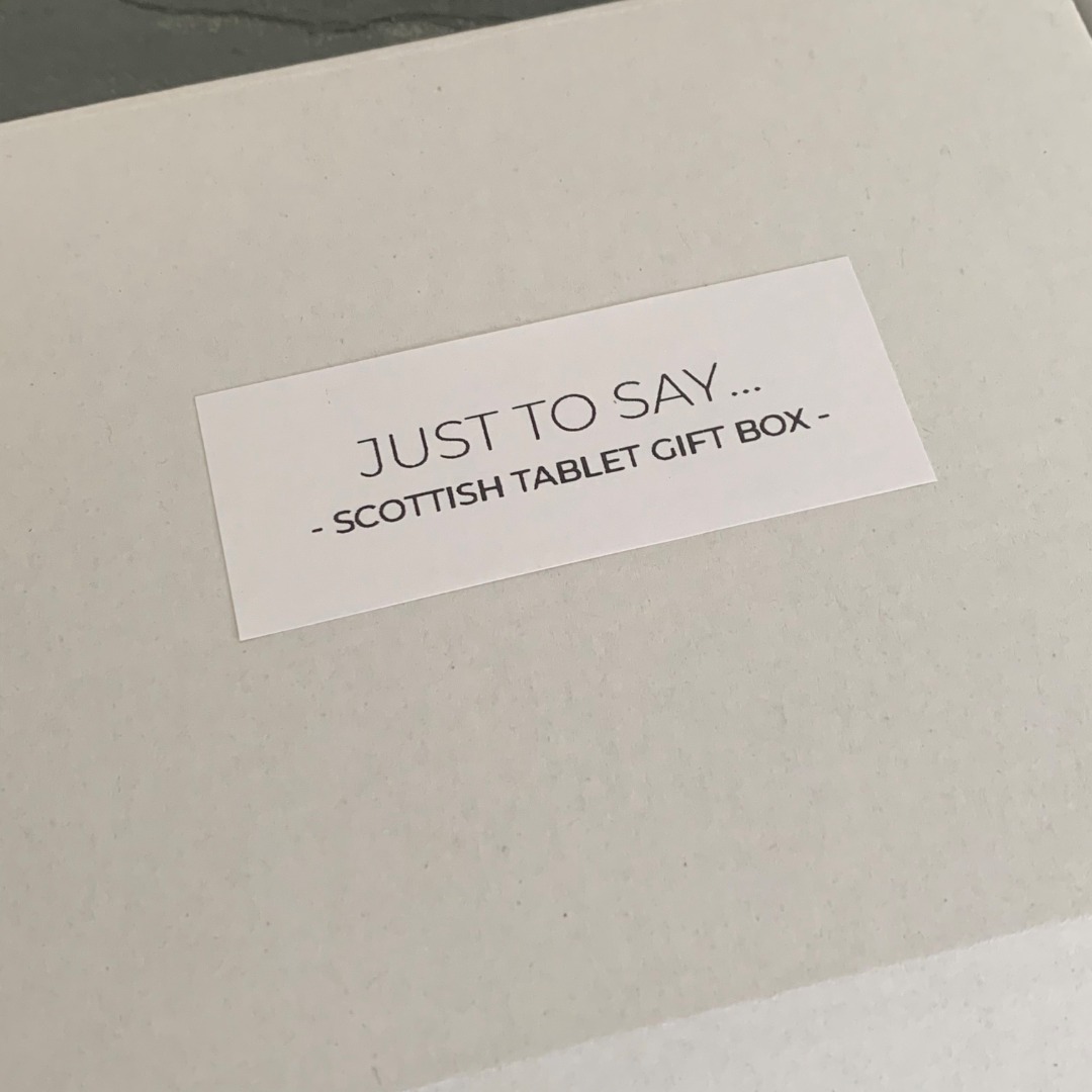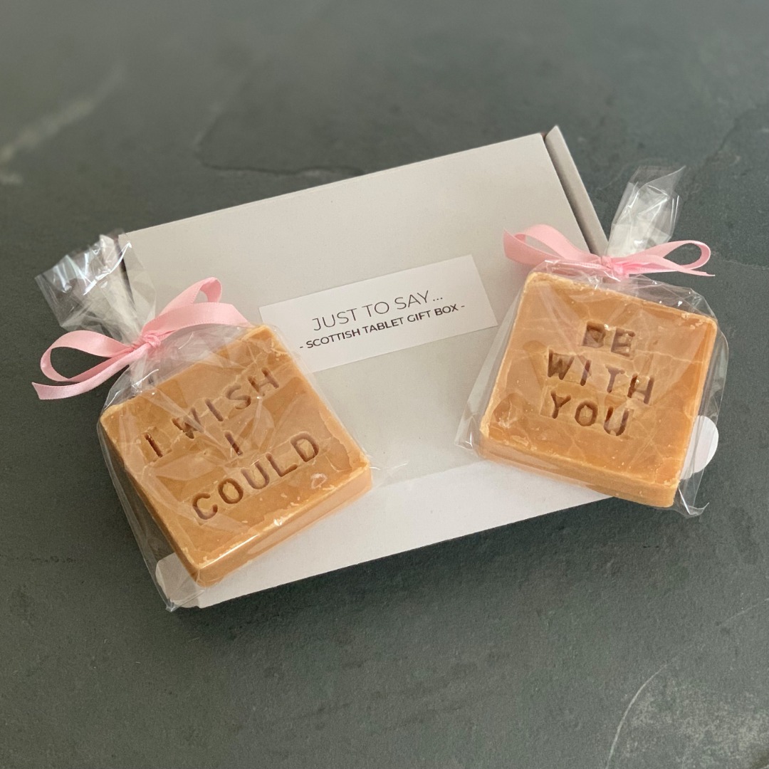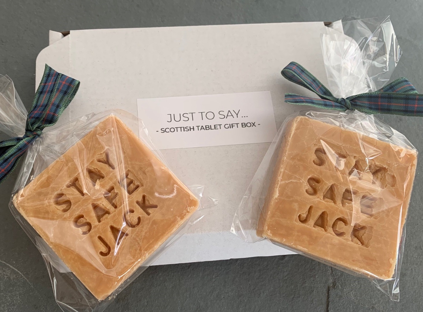 Small letterbox sized gift box of 2 individually wrapped traditional Scottish tablet sharing squares, tied with ribbon, enveloped in tissue and boxed.