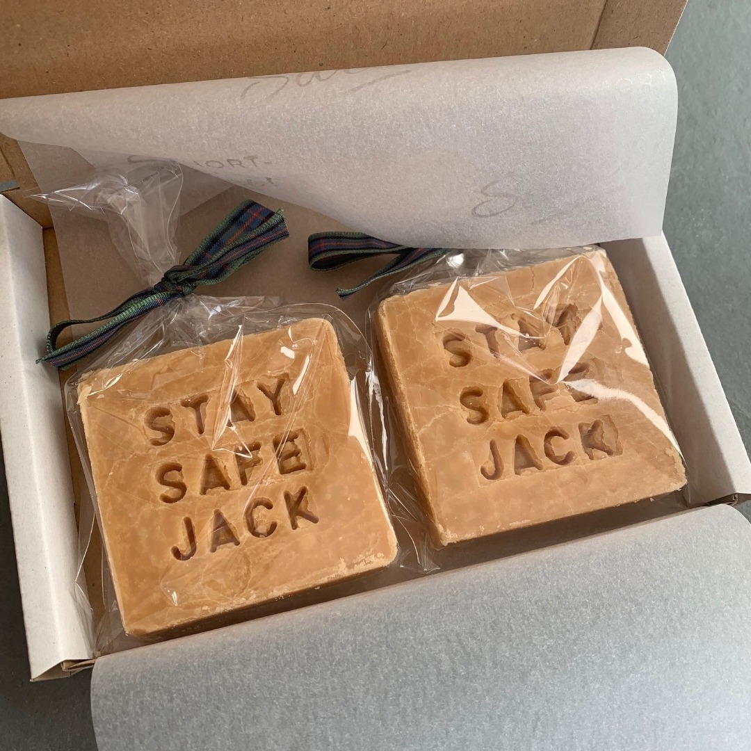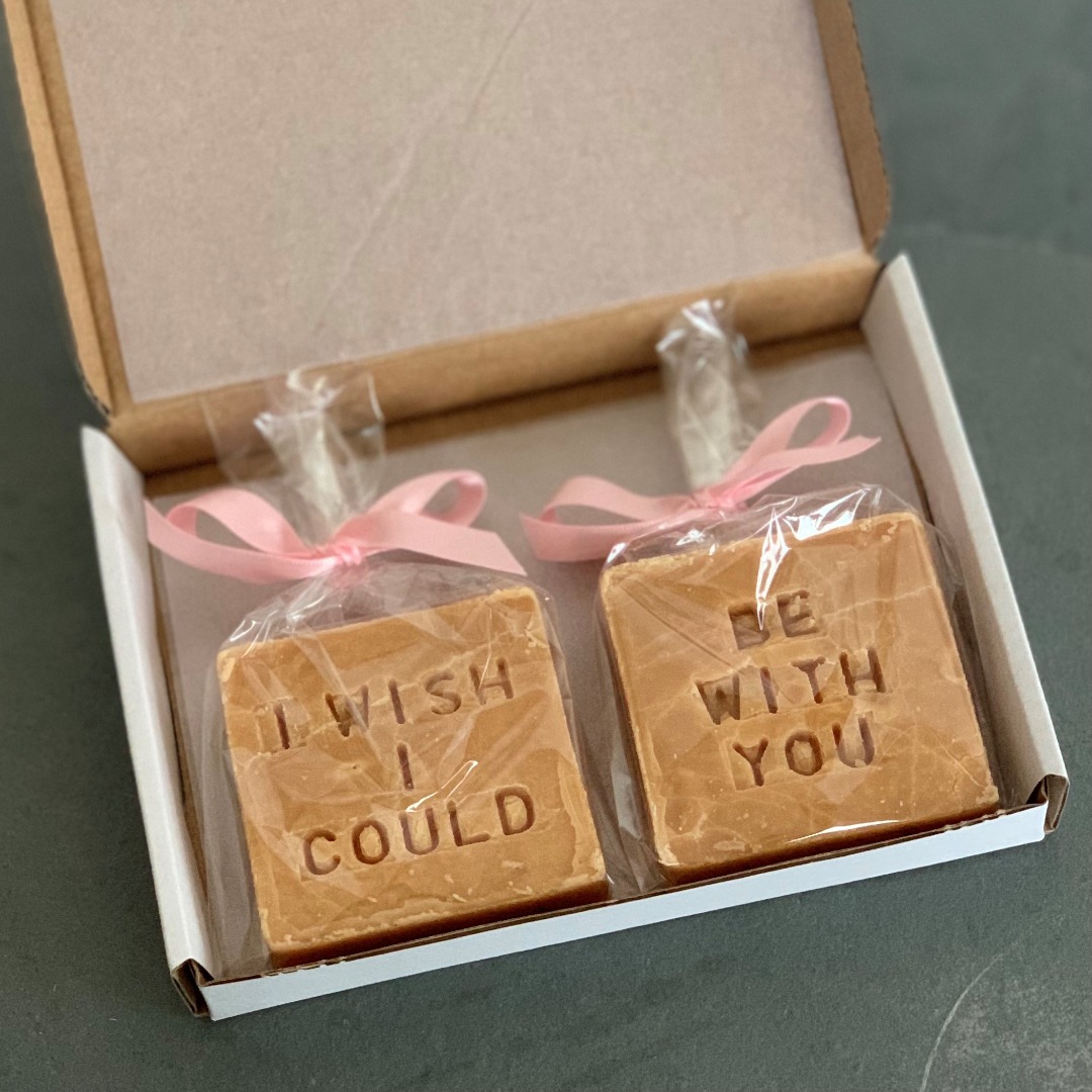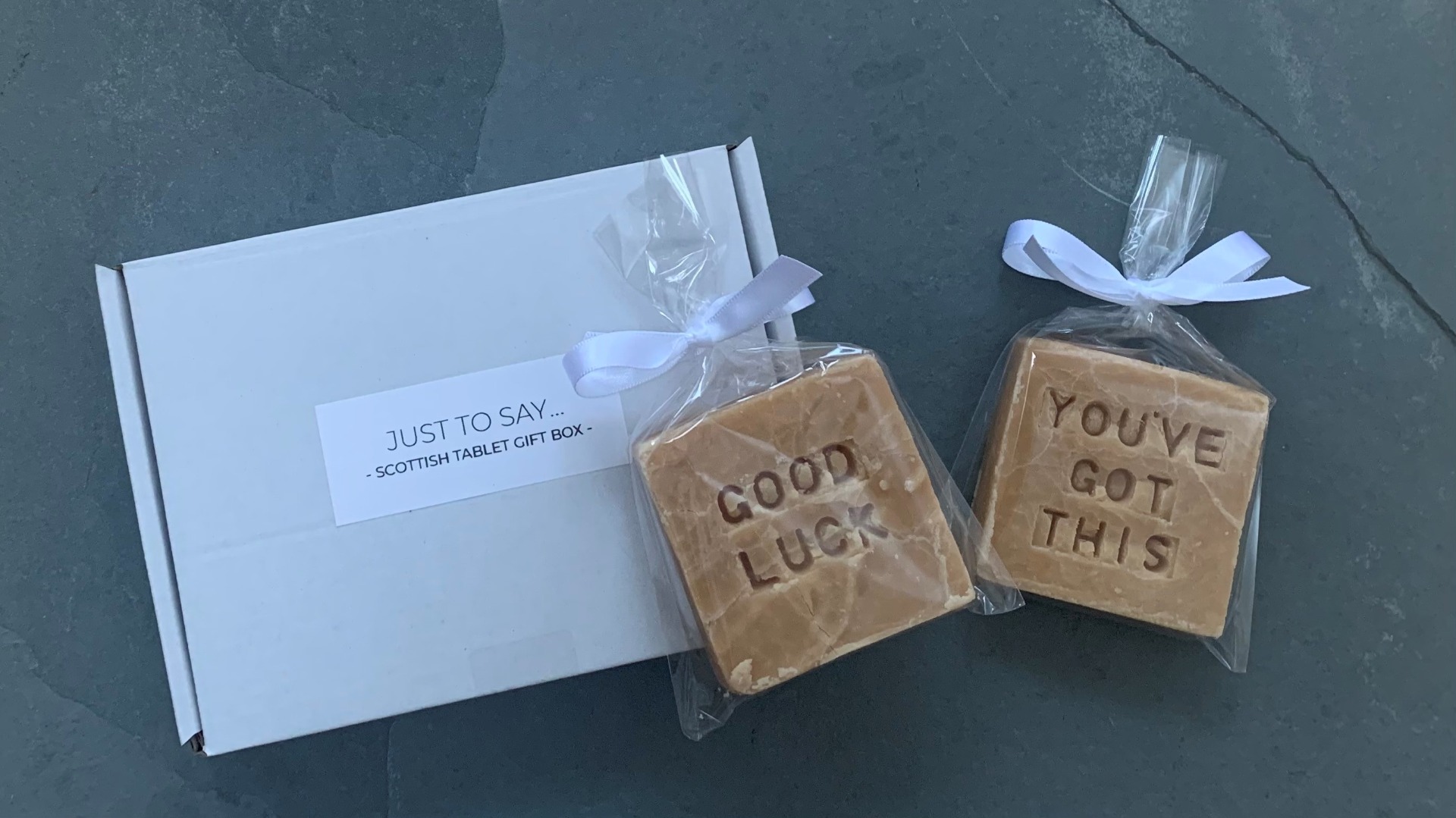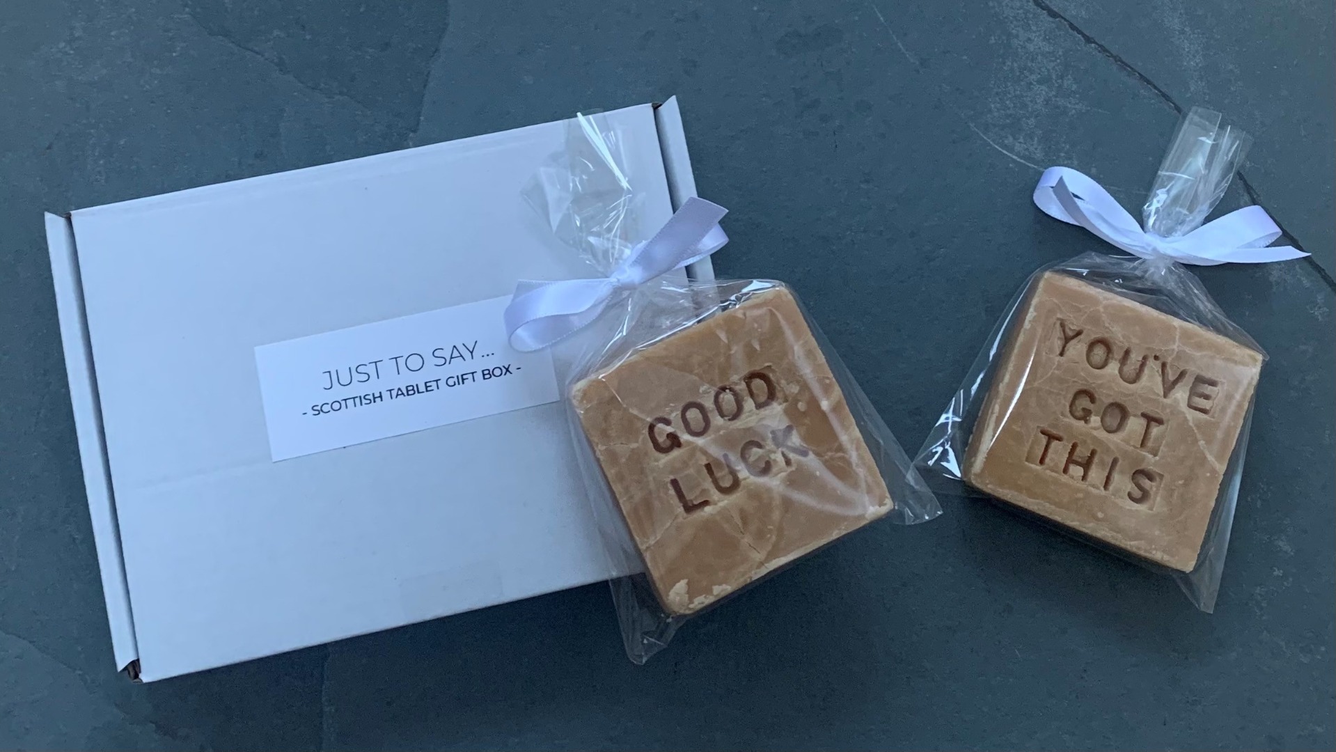Small letterbox sized gift box of 2 individually wrapped traditional Scottish tablet sharing squares, tied with ribbon, enveloped in tissue and boxed.