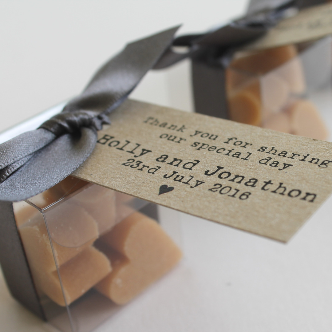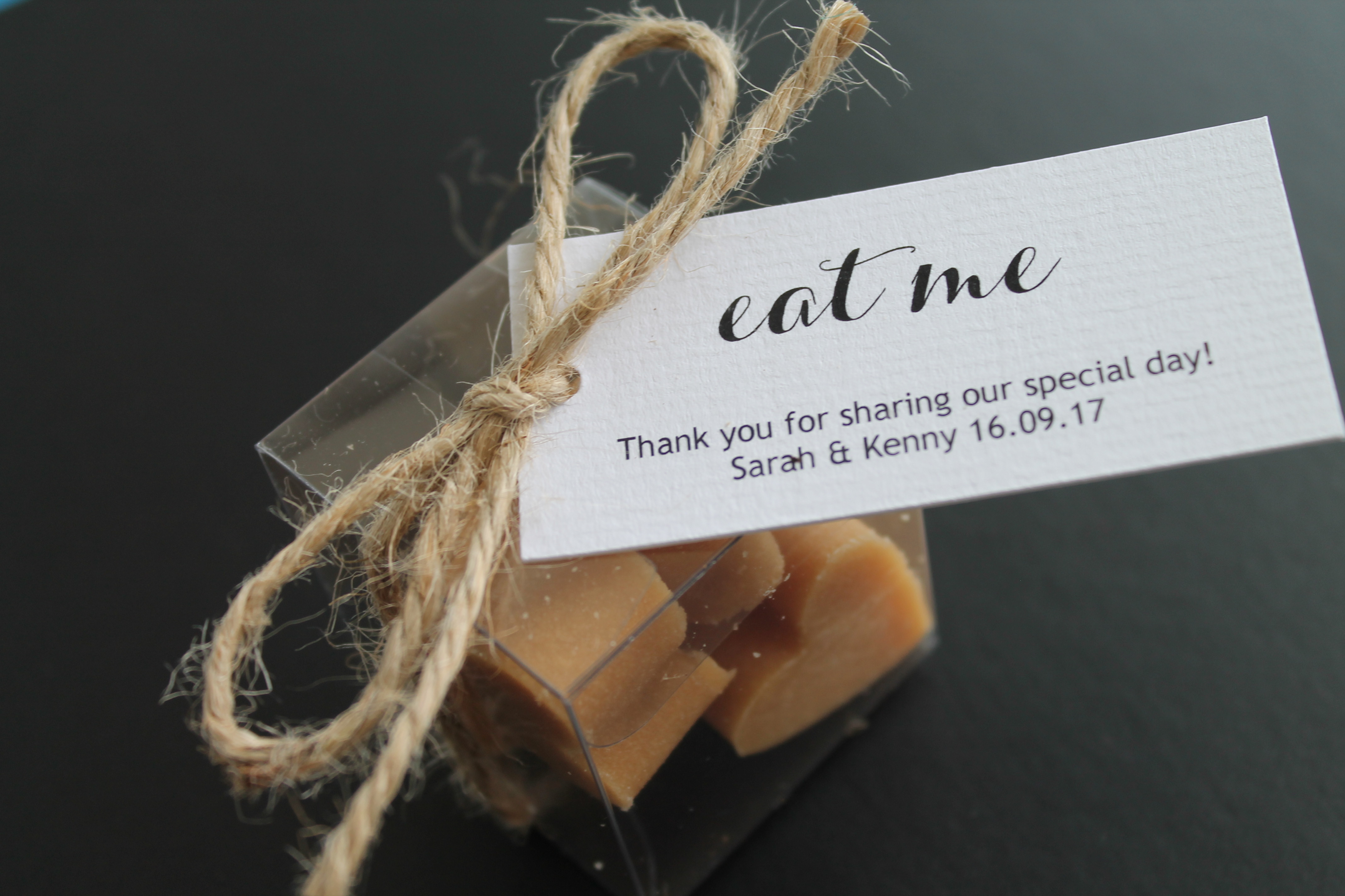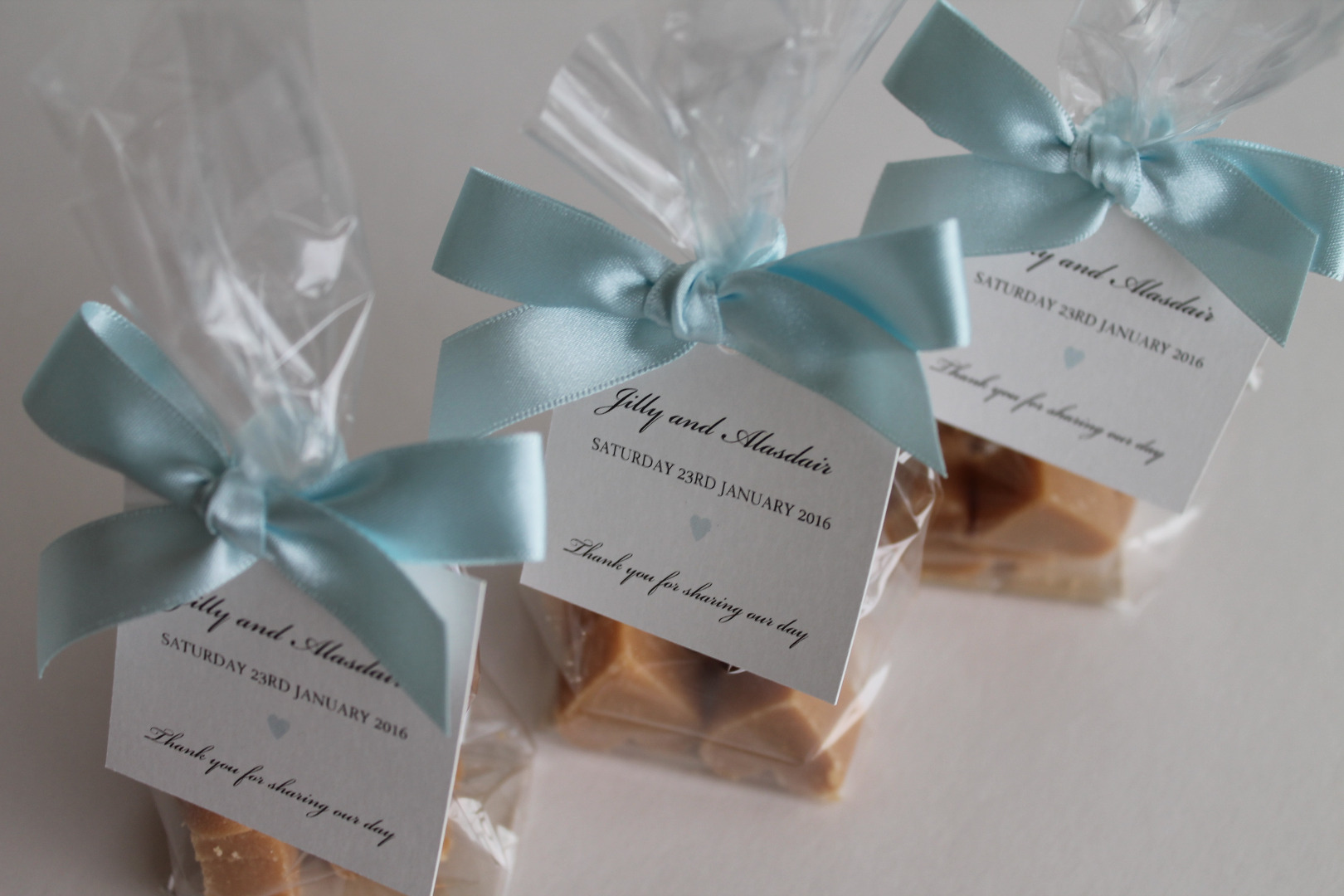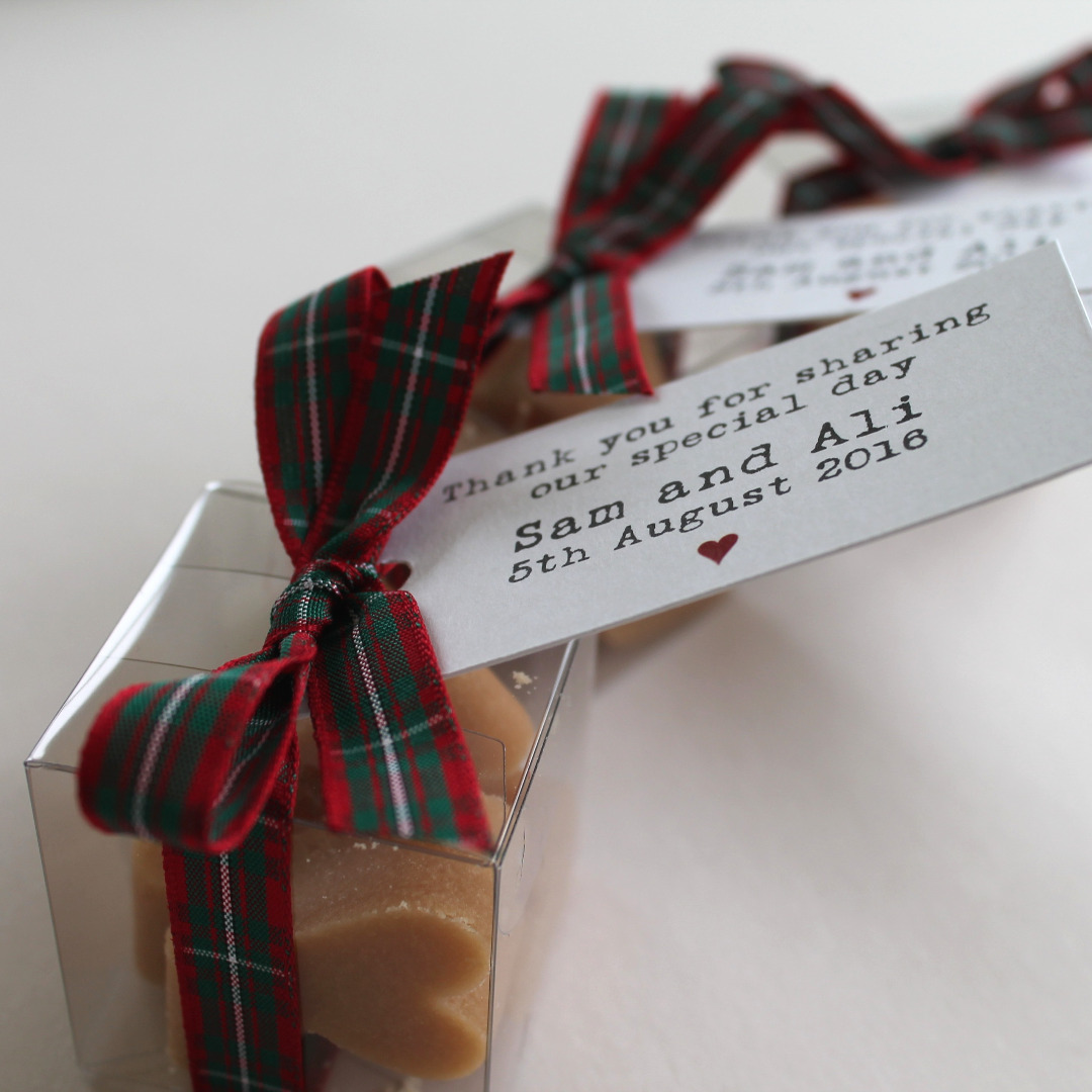 Our favours come in various sizes and packaging options, pictured and priced below, all include choice of ribbon or twine and personalised tag, unless stated otherwise. Delivery charge is additional. If you are interested in our different flavours (including whisky cream liqueur, malt whisky and white chocolate) or would prefer the tablet cut in chunks please contact us for prices. For favours tied with ribbon or twine alone, no tag, please deduct 25p from the prices quoted. Please ask about specific tag requirements as these can be designed to tie in with your wedding theme or other occasion.