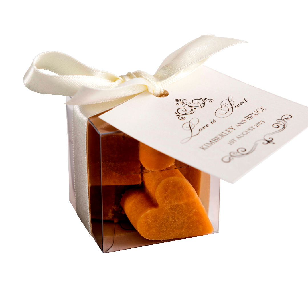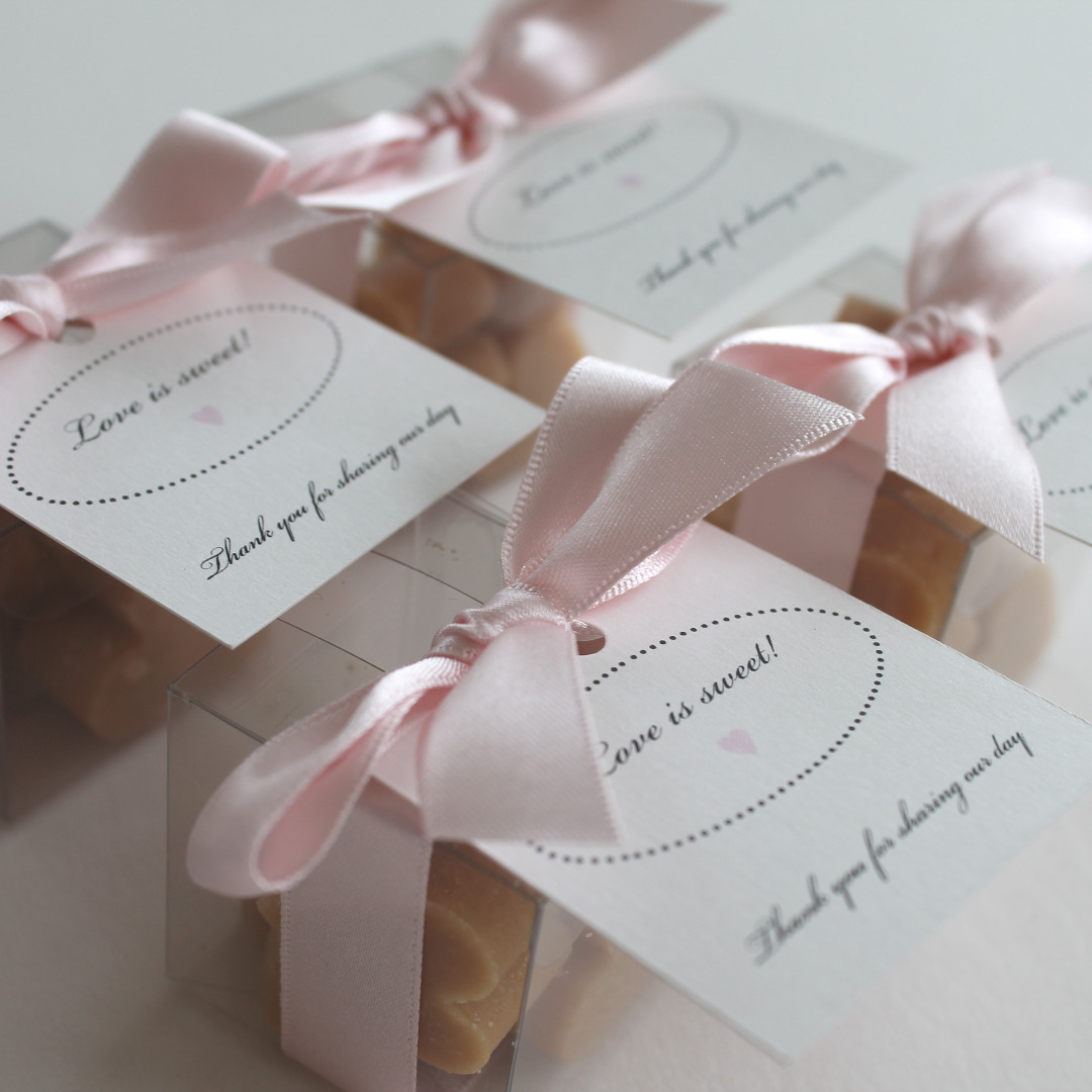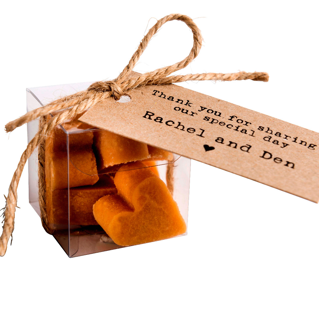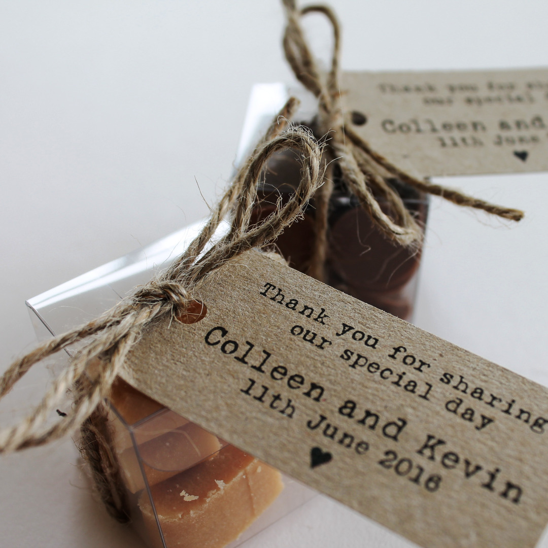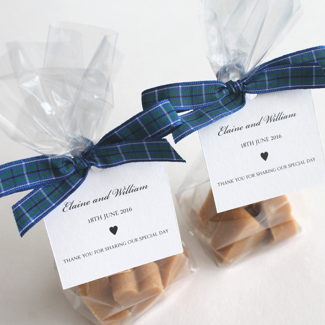 Our favours come in various sizes and packaging options, pictured and priced below, all include choice of ribbon or twine and personalised tag, unless stated otherwise. Delivery charge is additional. If you are interested in our different flavours (including whisky cream liqueur, malt whisky and white chocolate) or would prefer the tablet cut in chunks please contact us for prices. For favours tied with ribbon or twine alone, no tag, please deduct 25p from the prices quoted. Please ask about specific tag requirements as these can be designed to tie in with your wedding theme or other occasion.