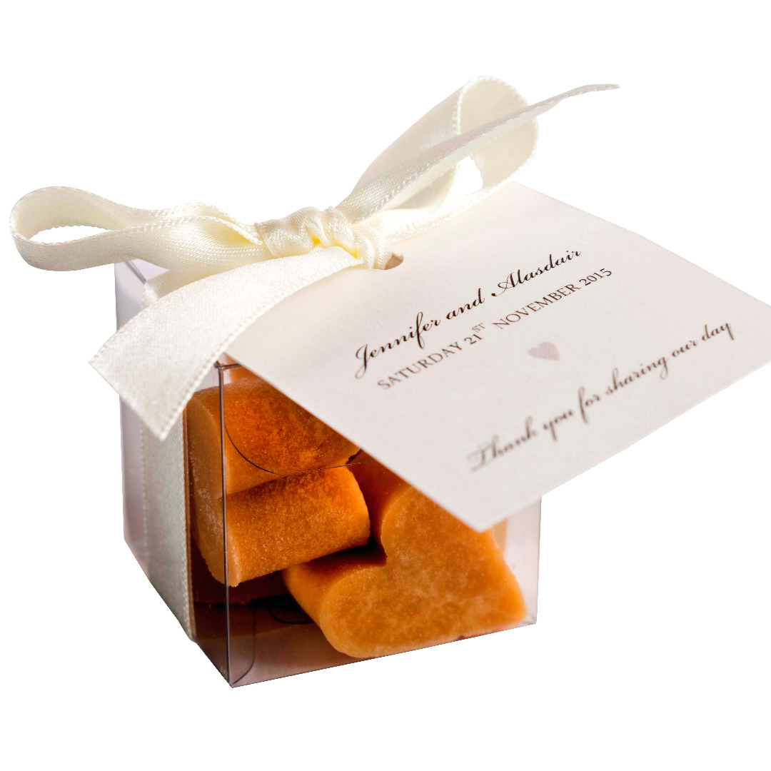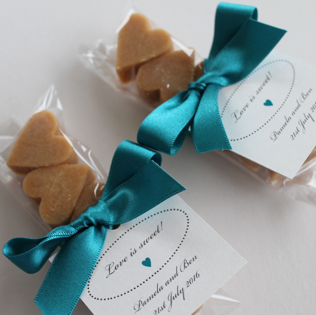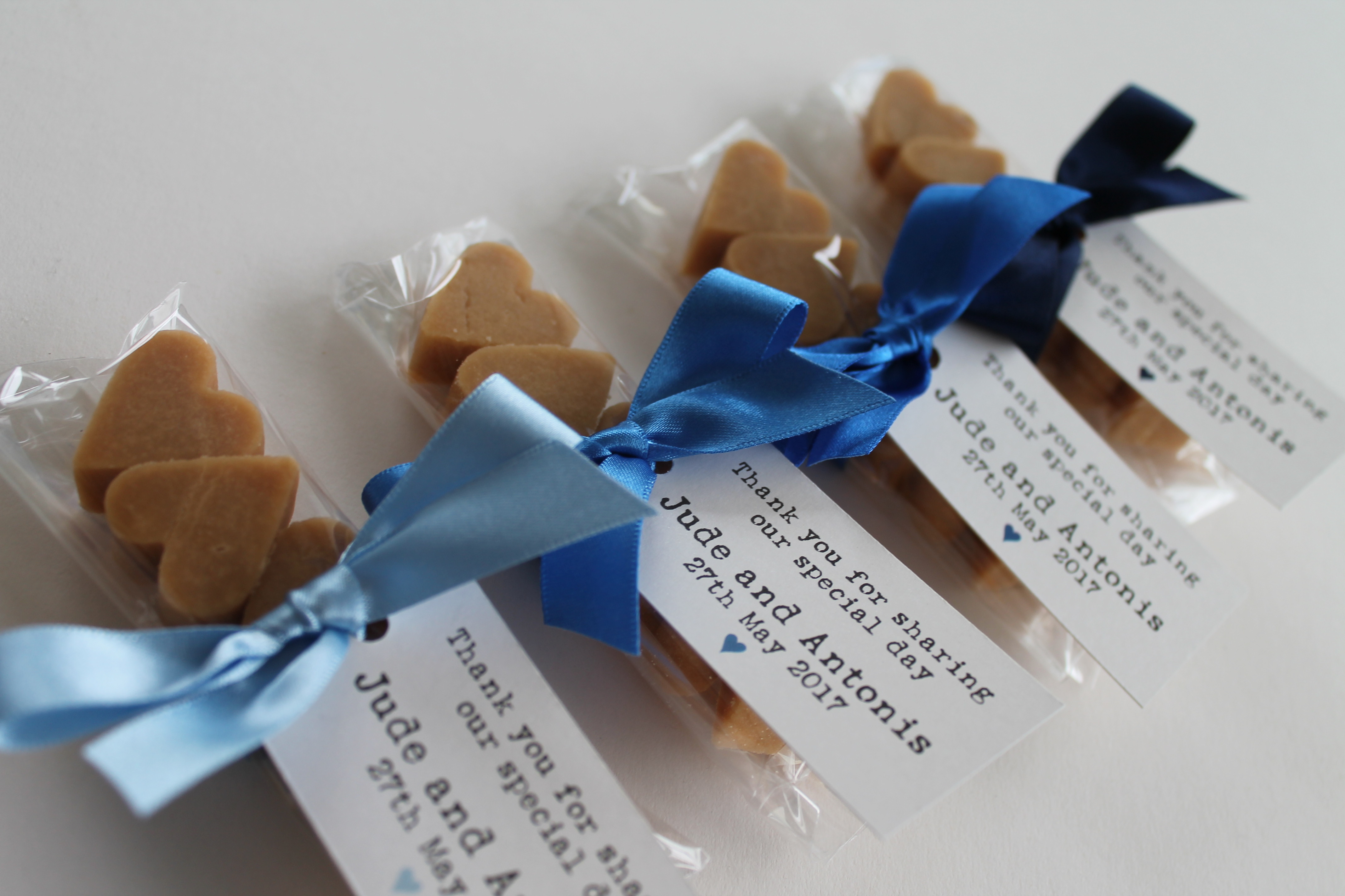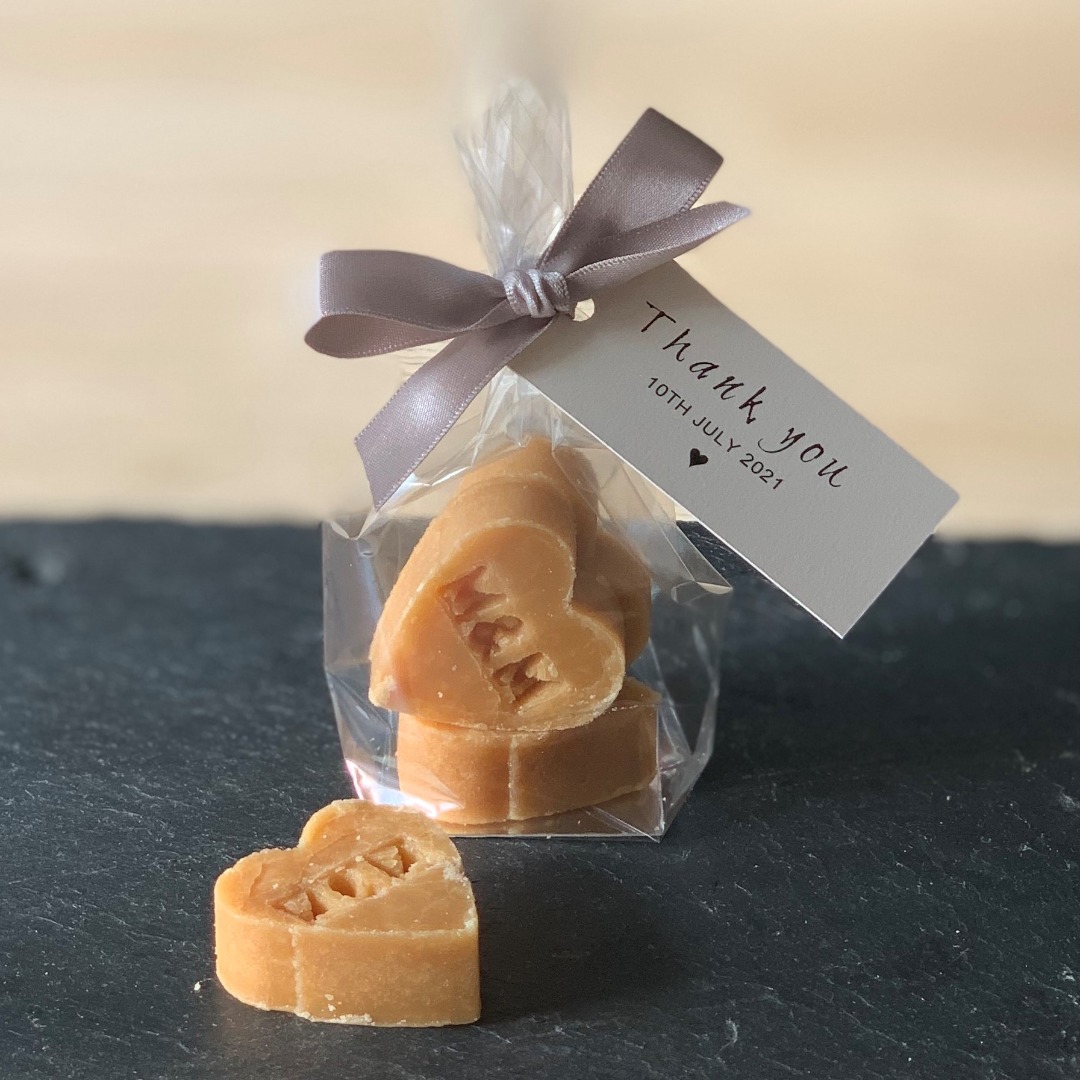 Our favours come in various sizes and packaging options, pictured and priced below, all include choice of ribbon or twine and personalised tag, unless stated otherwise. Delivery charge is additional. If you are interested in our different flavours (including whisky cream liqueur, malt whisky and white chocolate) or would prefer the tablet cut in chunks please contact us for prices. For favours tied with ribbon or twine alone, no tag, please deduct 25p from the prices quoted. Please ask about specific tag requirements as these can be designed to tie in with your wedding theme or other occasion.