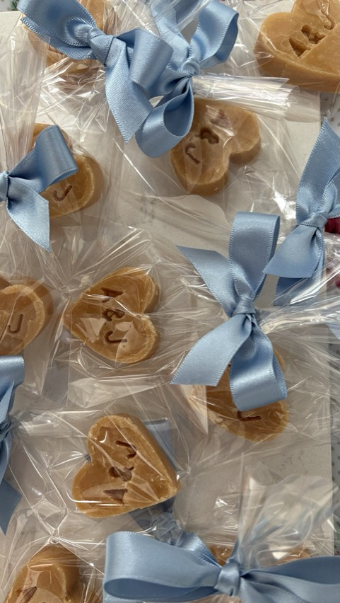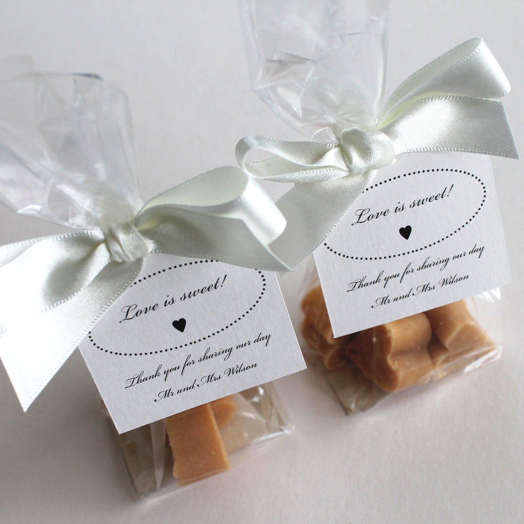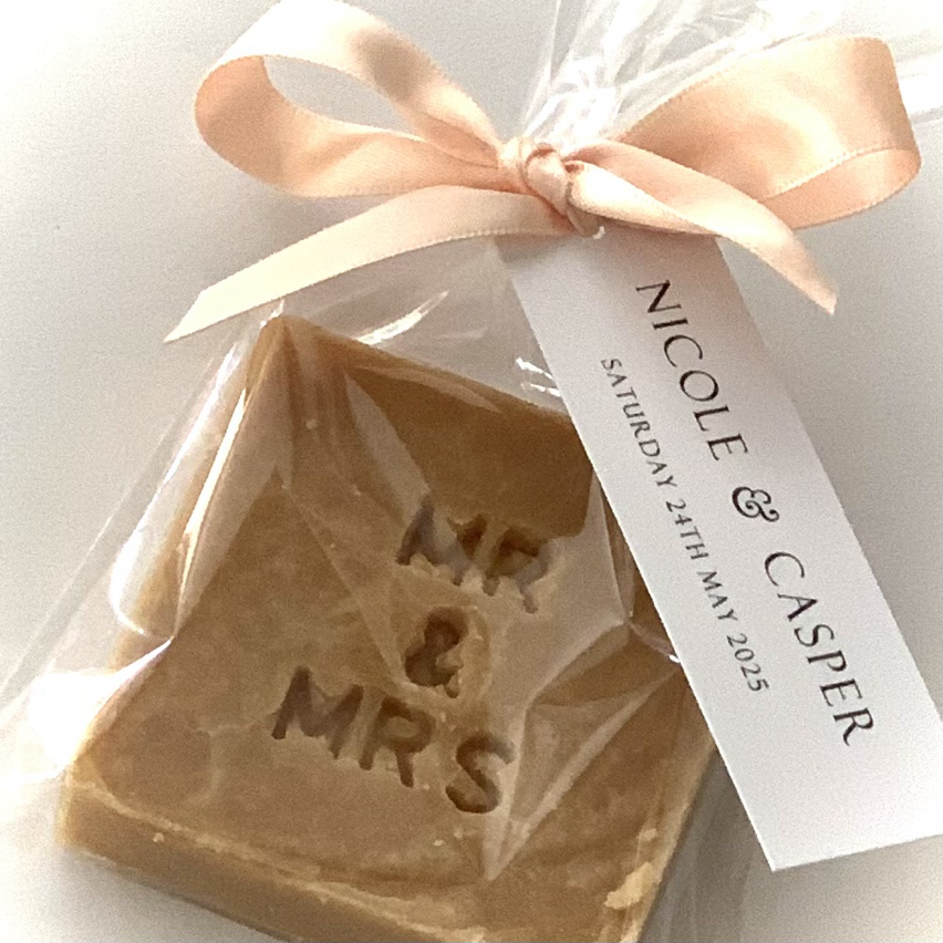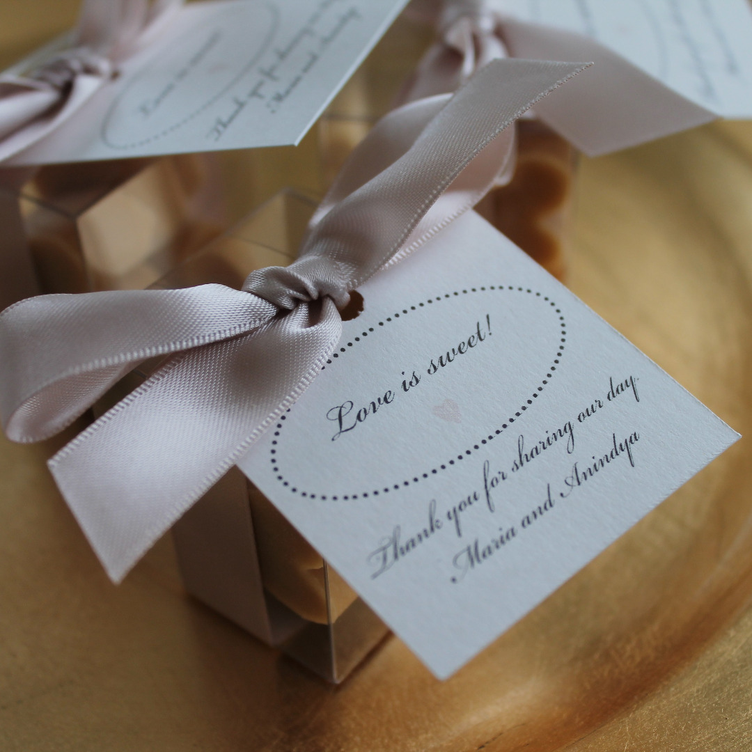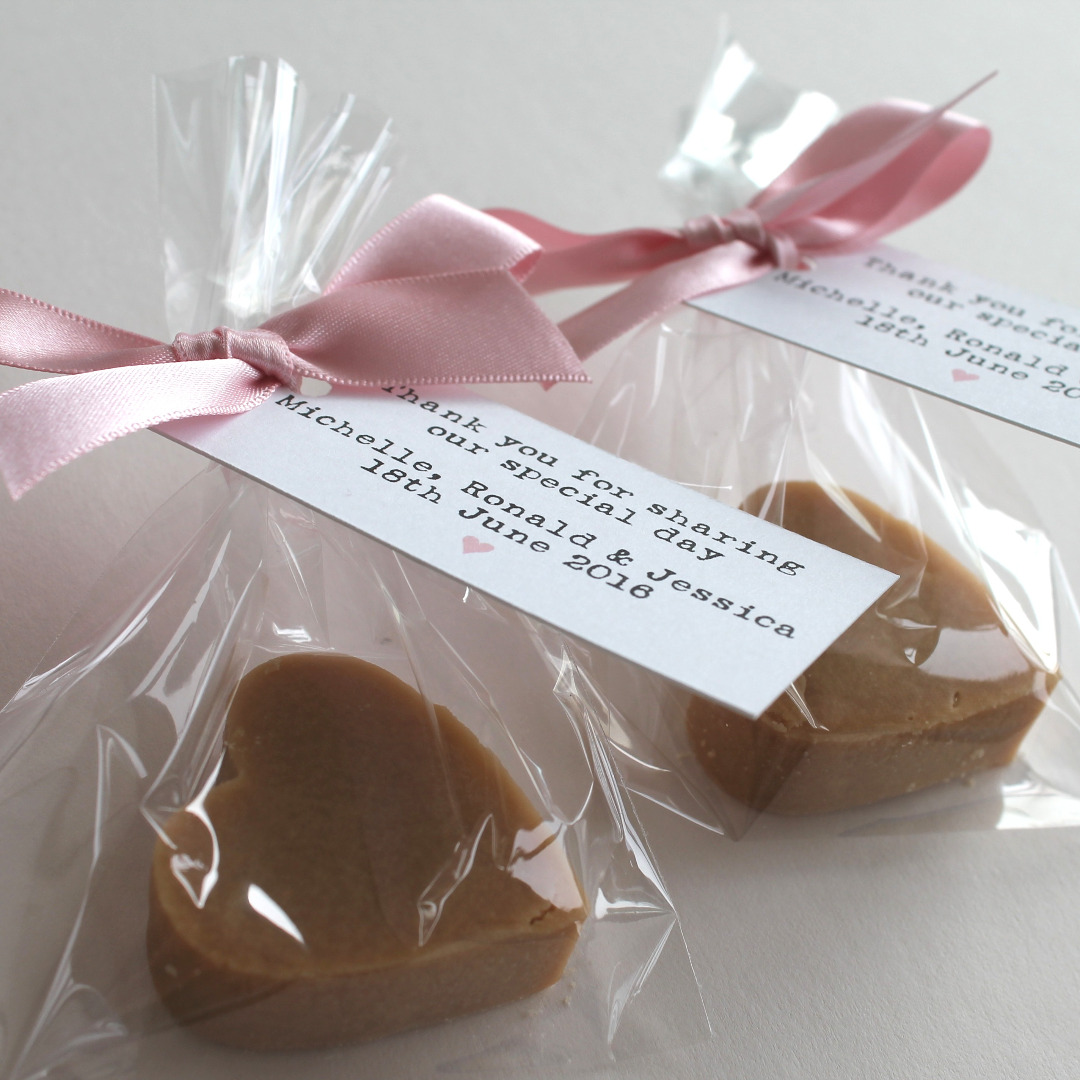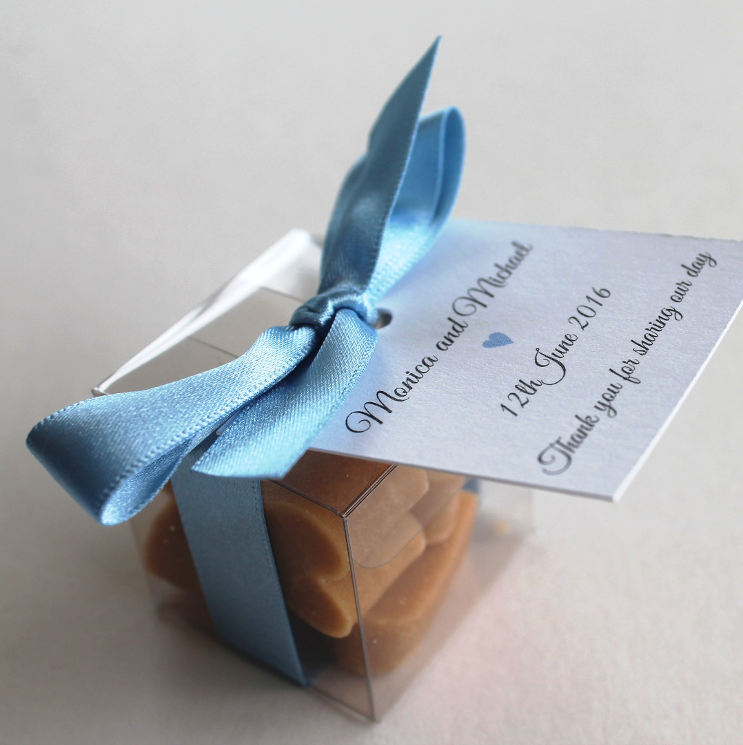 Our favours come in various sizes and packaging options, pictured and priced below, all include choice of ribbon or twine and personalised tag, unless stated otherwise. Delivery charge is additional. If you are interested in our different flavours (including whisky cream liqueur, malt whisky and white chocolate) or would prefer the tablet cut in chunks please contact us for prices. For favours tied with ribbon or twine alone, no tag, please deduct 25p from the prices quoted. Please ask about specific tag requirements as these can be designed to tie in with your wedding theme or other occasion.